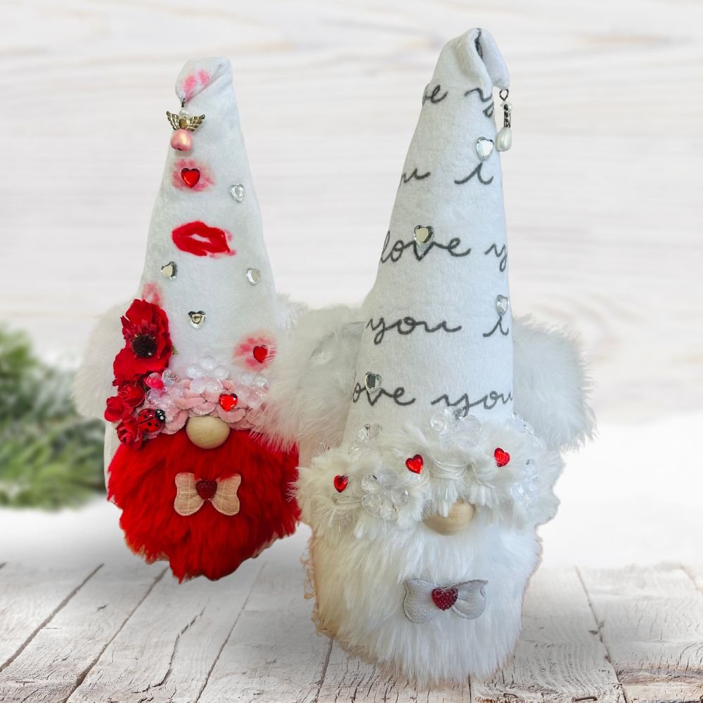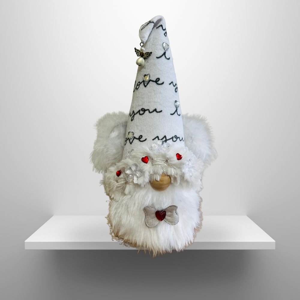This beautiful gnome features a plush fabric body and a luxurious hat adorned with angel embellishments, delicate crocheted details, shimmering crystals, tiny liny hearts, and other decorative elements that make it a truly unique collectible piece. The soft white feather wings give it a celestial, angelic appearance, evoking feelings of love, protection, and serenity.
