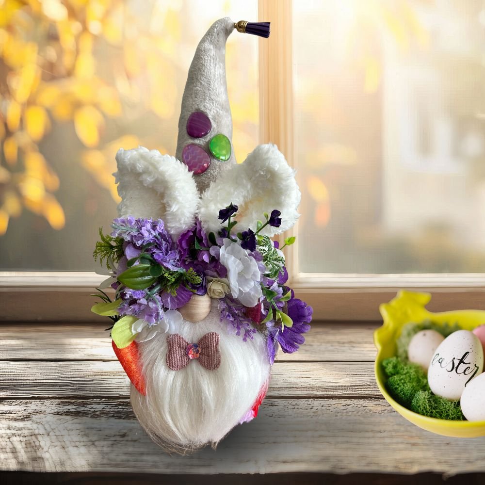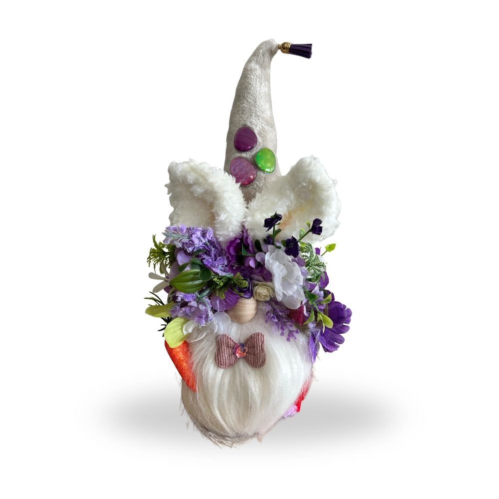 This enchanting gnome features a luxurious velvet hat accented with a cute tassel, three shiny Easter egg embellishments, and surrounded by beautiful purple floral accents that add a gentle, soothing pop of color. The plush fabric body gives it a cozy feel, while the hand-sewn sherpa bunny ears and fluffy bunny tail create an irresistibly sweet bunny-inspired design.